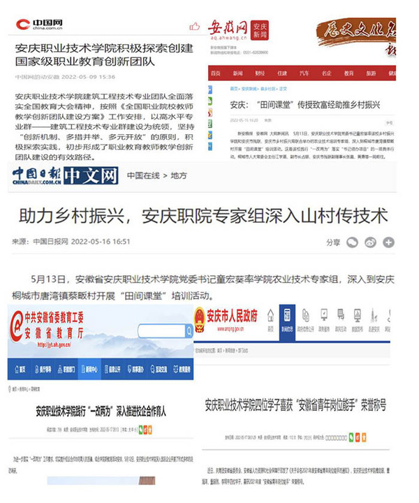 校宣傳部在職教周活動開展期間,進行了一系列的新聞報道工作。通過闆報、網站、電視、報紙、微信、QQ平台等形式,着力宣傳報道職業教育政策、職業教育成果、優秀畢業生事迹和職業教育服務經濟社會發展的典型事例,先後被《中國日報網》《中國網》《安徽教育網》《安慶市人民政府網》《掌上安慶》《安慶日報》等轉發報道。并聯合團委緊扣活動周主題,暨中國共産主義青年團成立100周年,開展了“青春心向黨 建功新時代”快閃微視頻拍攝活動。展示職教學子逐夢成長,為生活帶來成功與幸福的成長足迹,展顯出職教師生積極向上,奮發進取的精神風貌和熟練的專業技能。